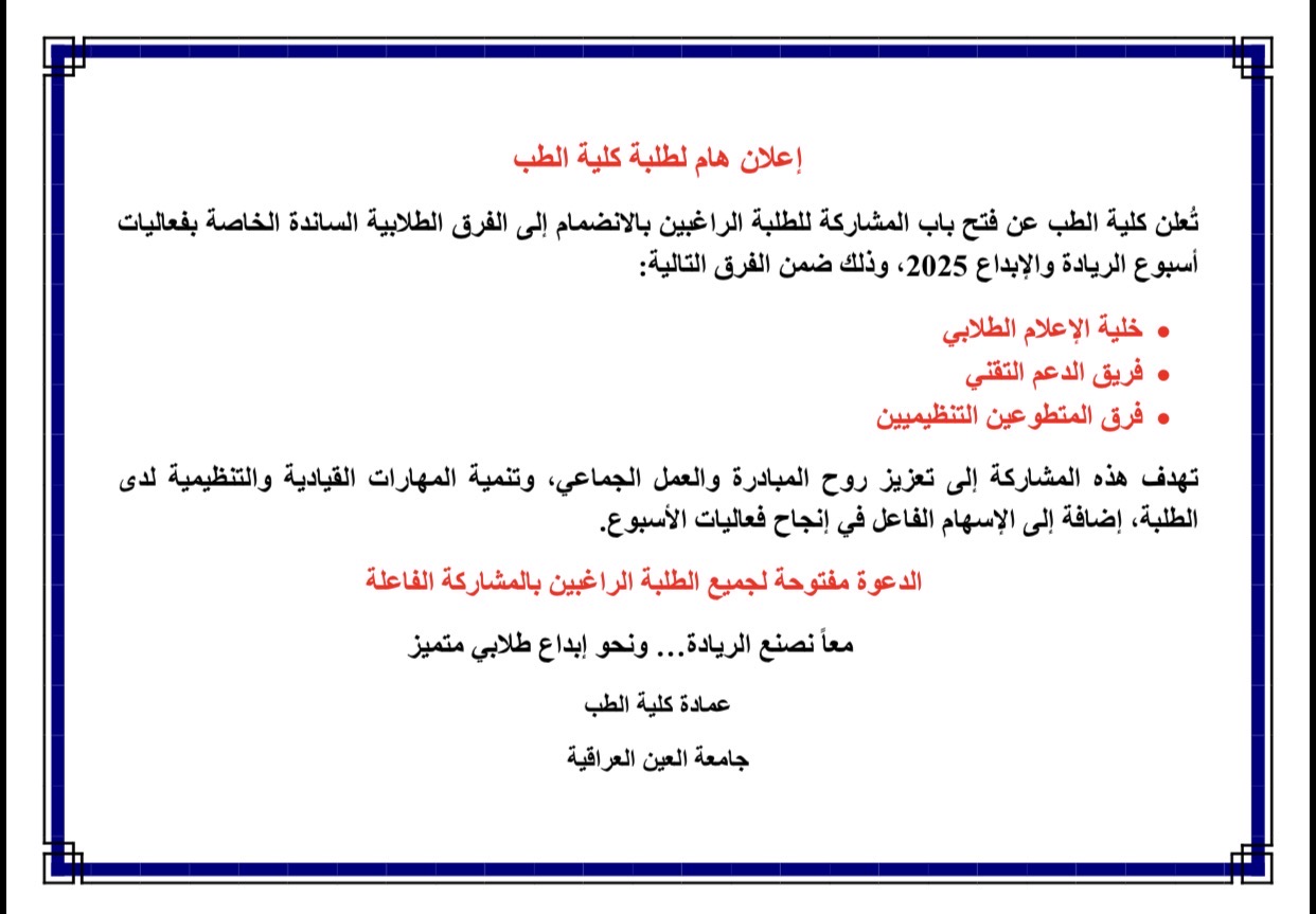 تعلن كلية الطب عن فتح باب المشاركة للطلبة الراغبين بالانضمام إلى الفرق الطلابية الساندة الخاصة بفعاليات أسبوع الريادة والإبداع